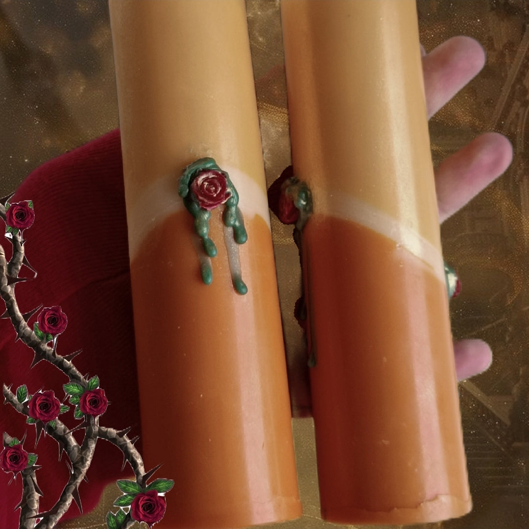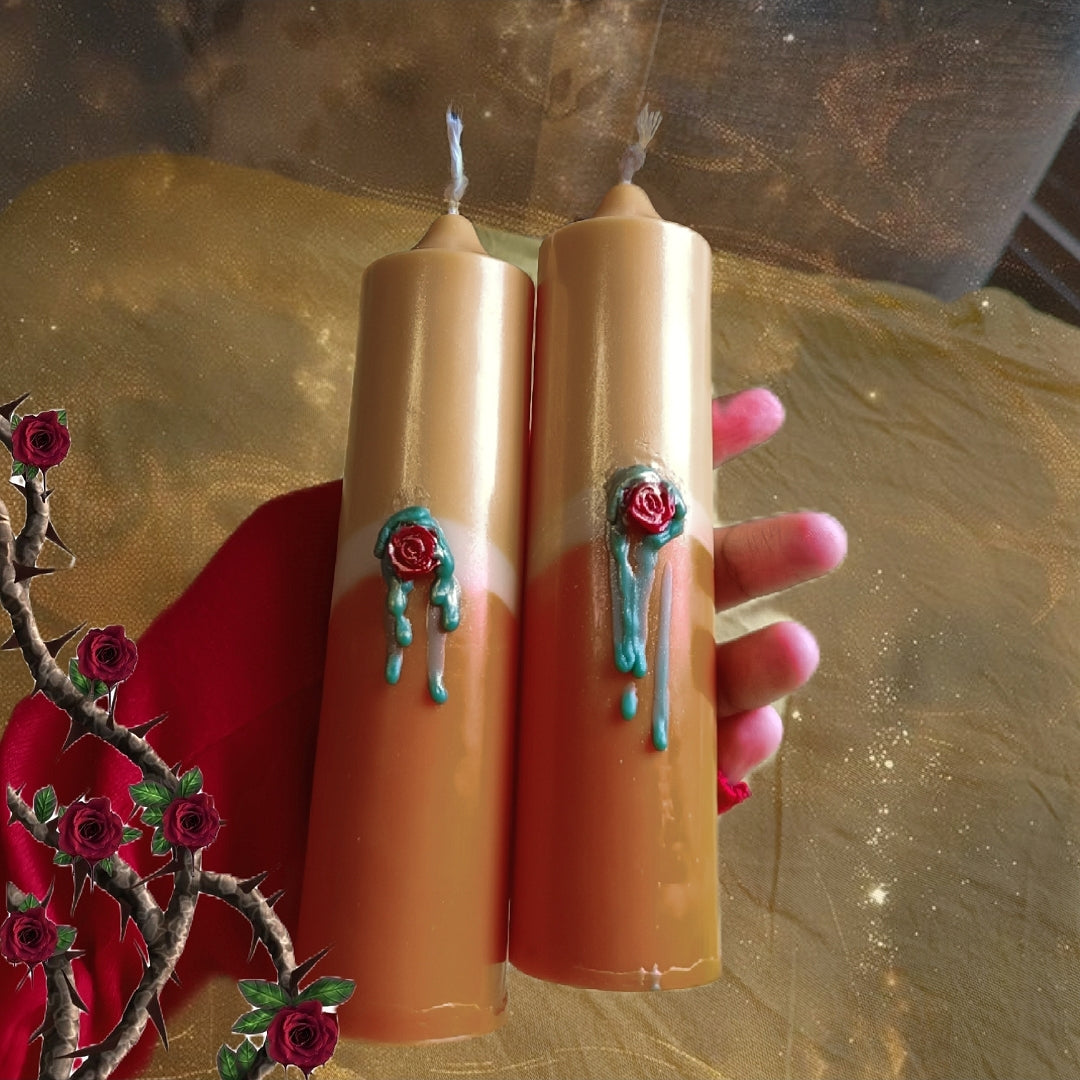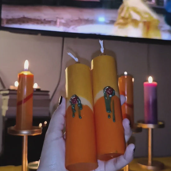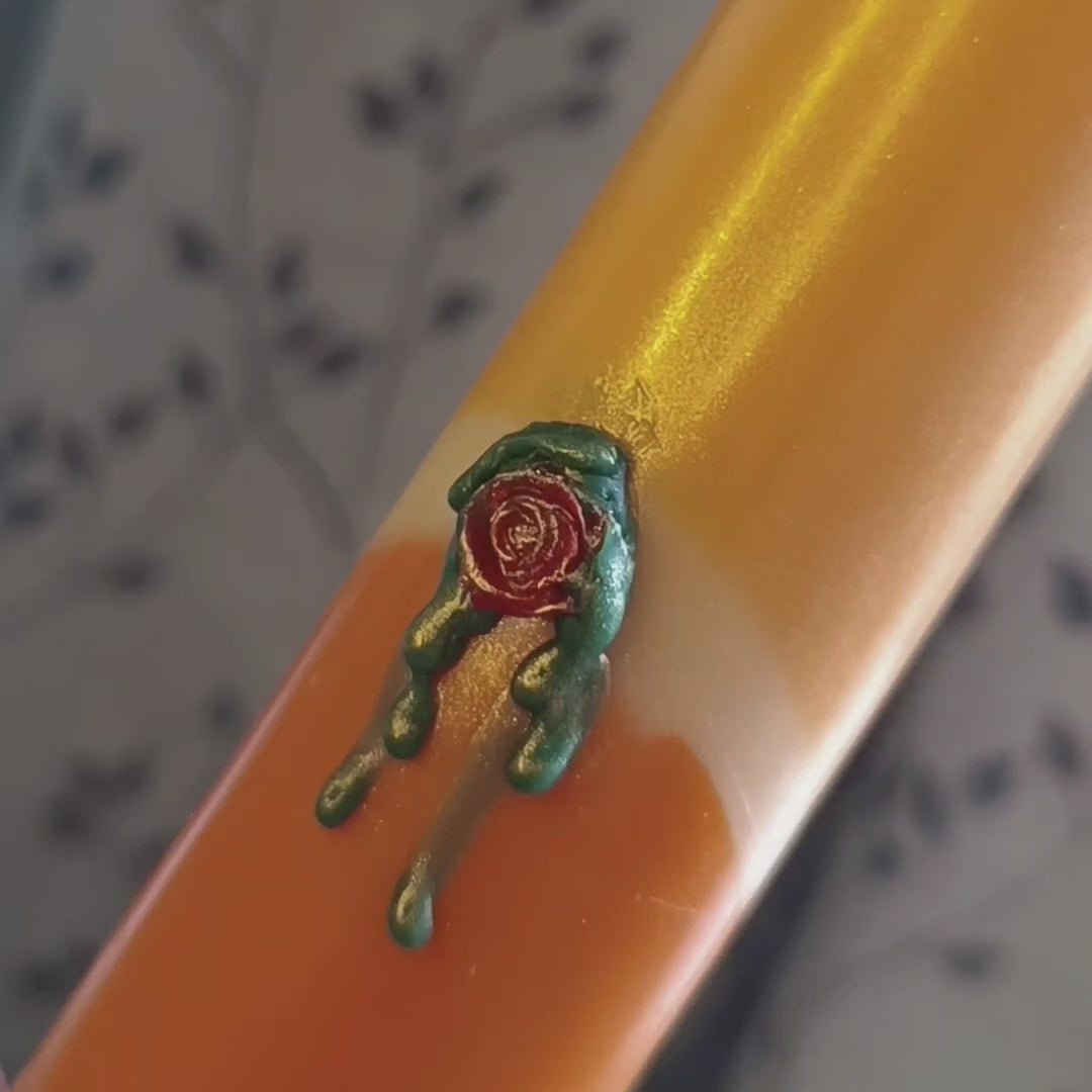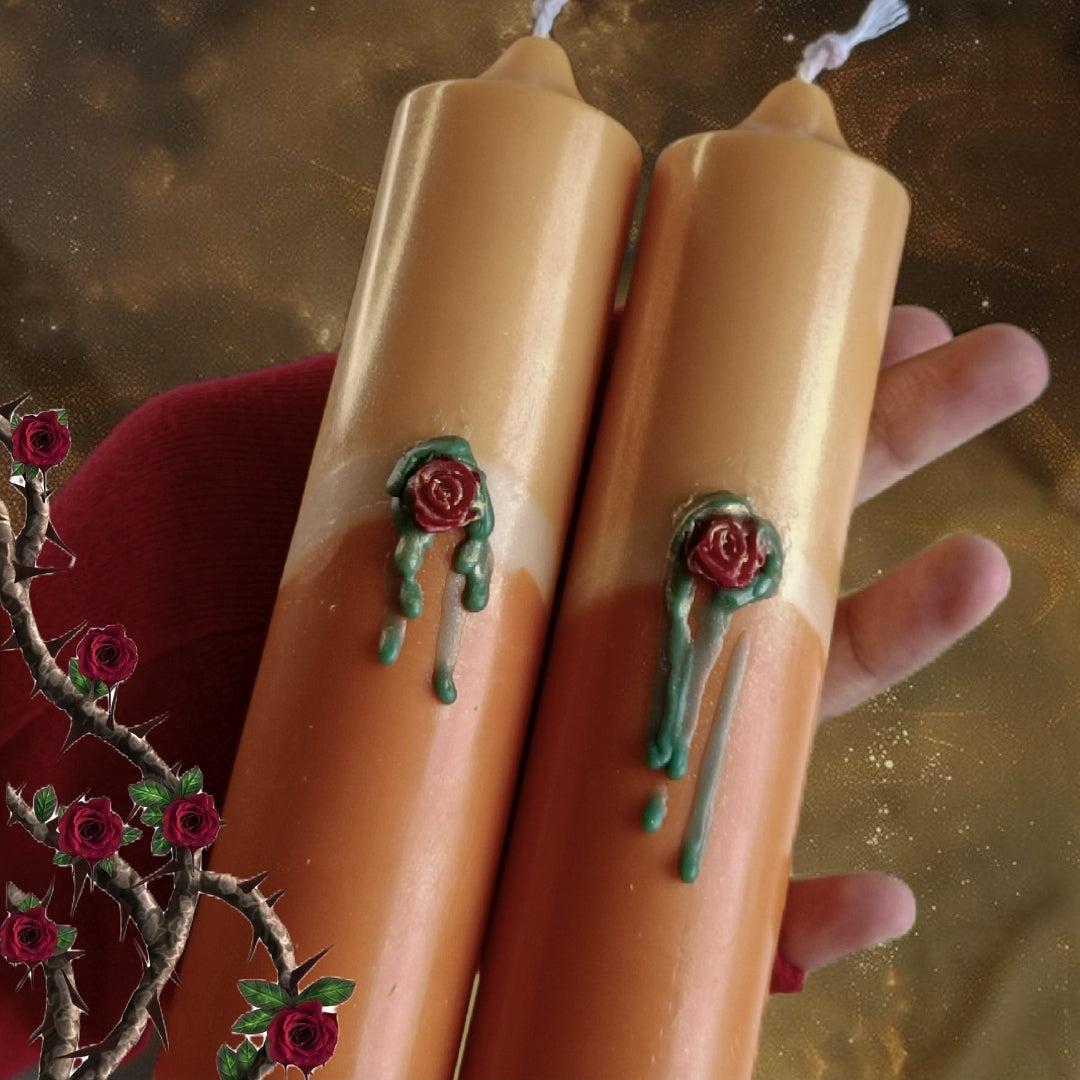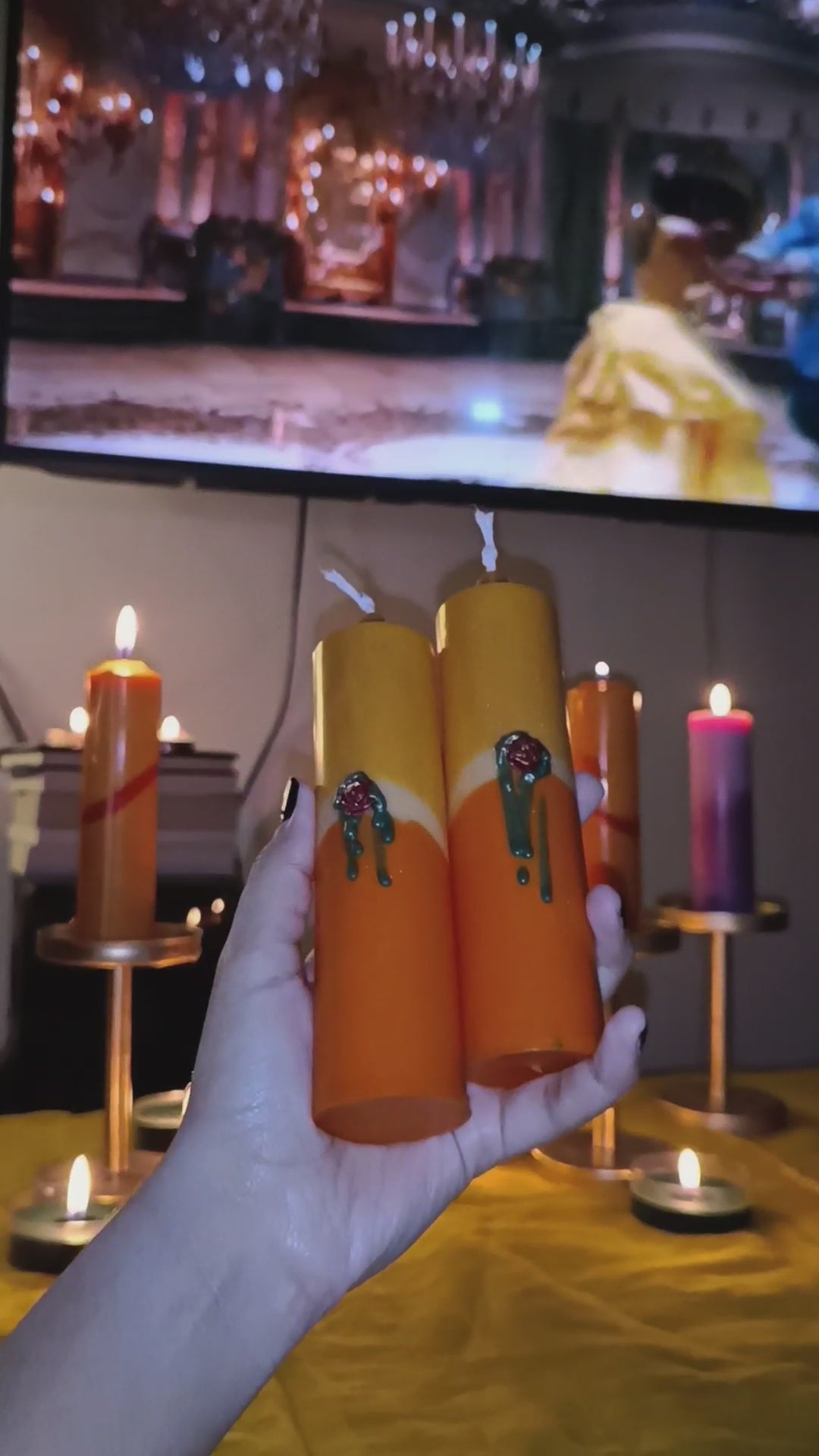 Not your ordinary candles, these are handcrafted art pieces. Each set takes hours of careful work, from blending the perfect shades of Belle’s golden gown to hand pouring, engraving the rose and layering gold mica for that ballroom shimmer. The enchanted green drips are part of the artistry that holds the rose in place, making every candle unique and impossible to replicate by a machine. Since they are handmade, no two will ever be exactly alike and small imperfections are part of their charm.