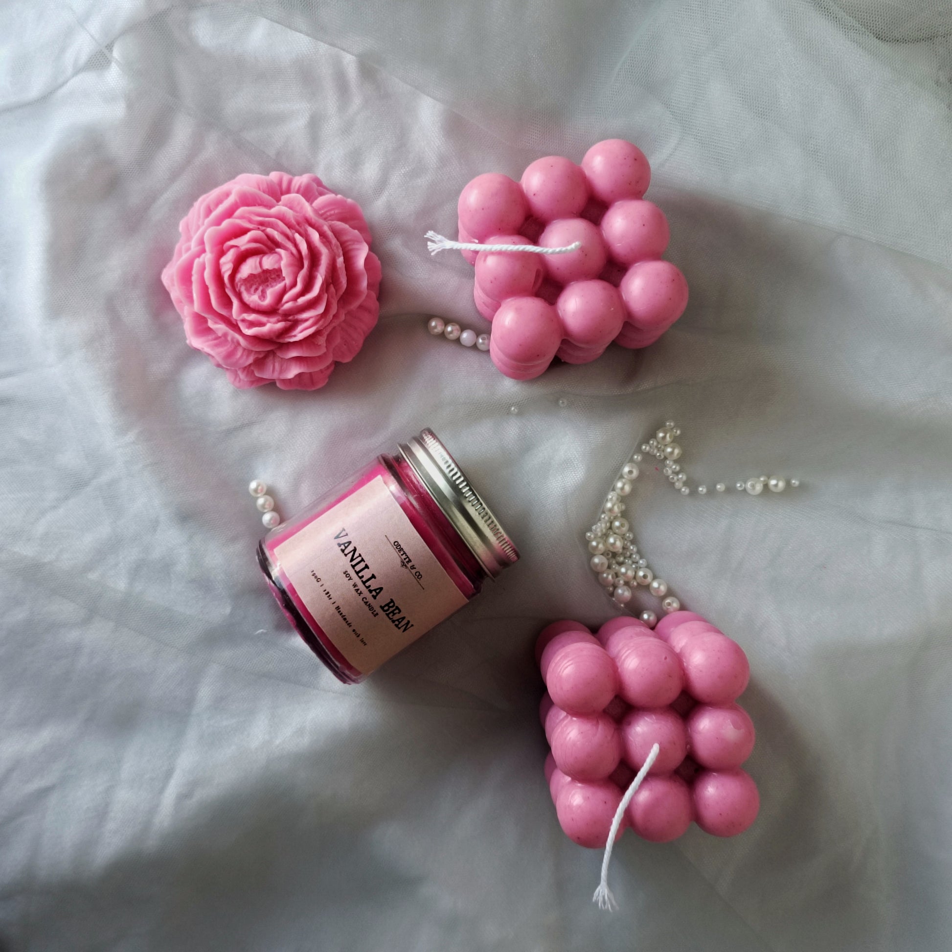 Soft, romantic, and wrapped in a warm blush palette — this set is a celebration of grace in every form. Featuring two delicate bubble candles, one cozy jar candle, and a blooming peony candle, each piece is handcrafted to elevate your space with quiet beauty and charm.